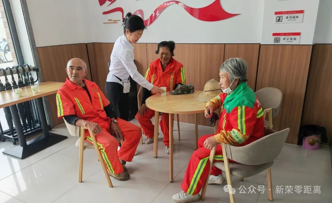 山西省大同市新荣区社区工作者在党群服务站与环卫工人沟通交流。