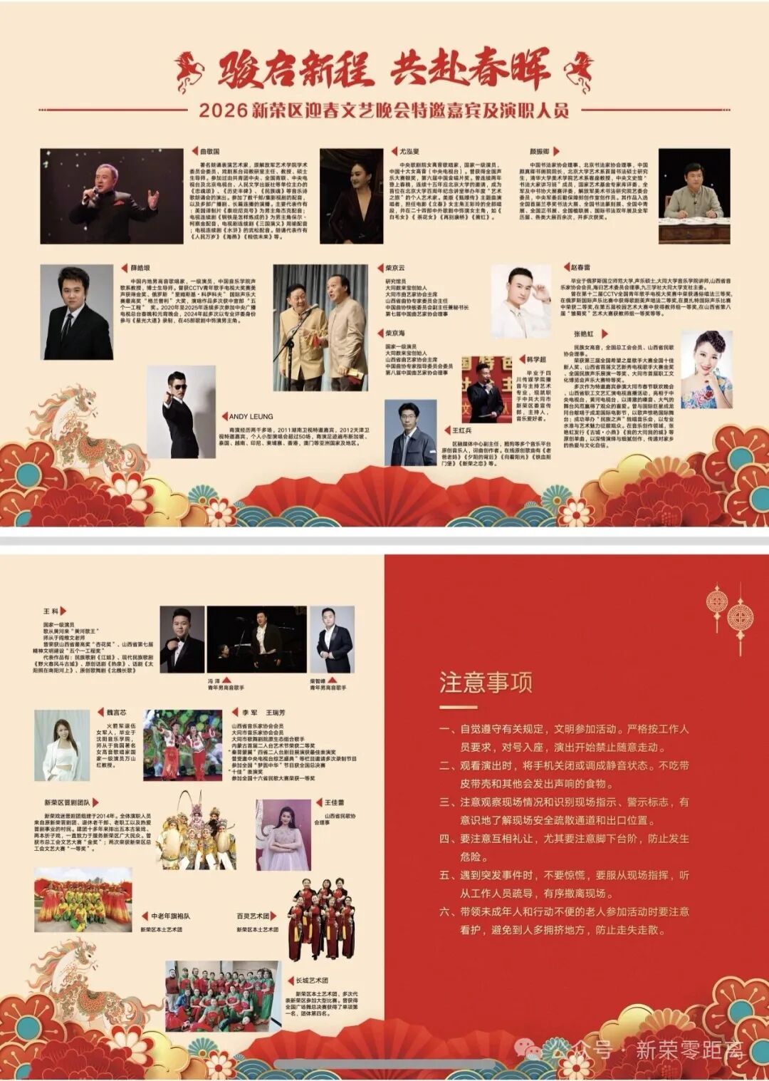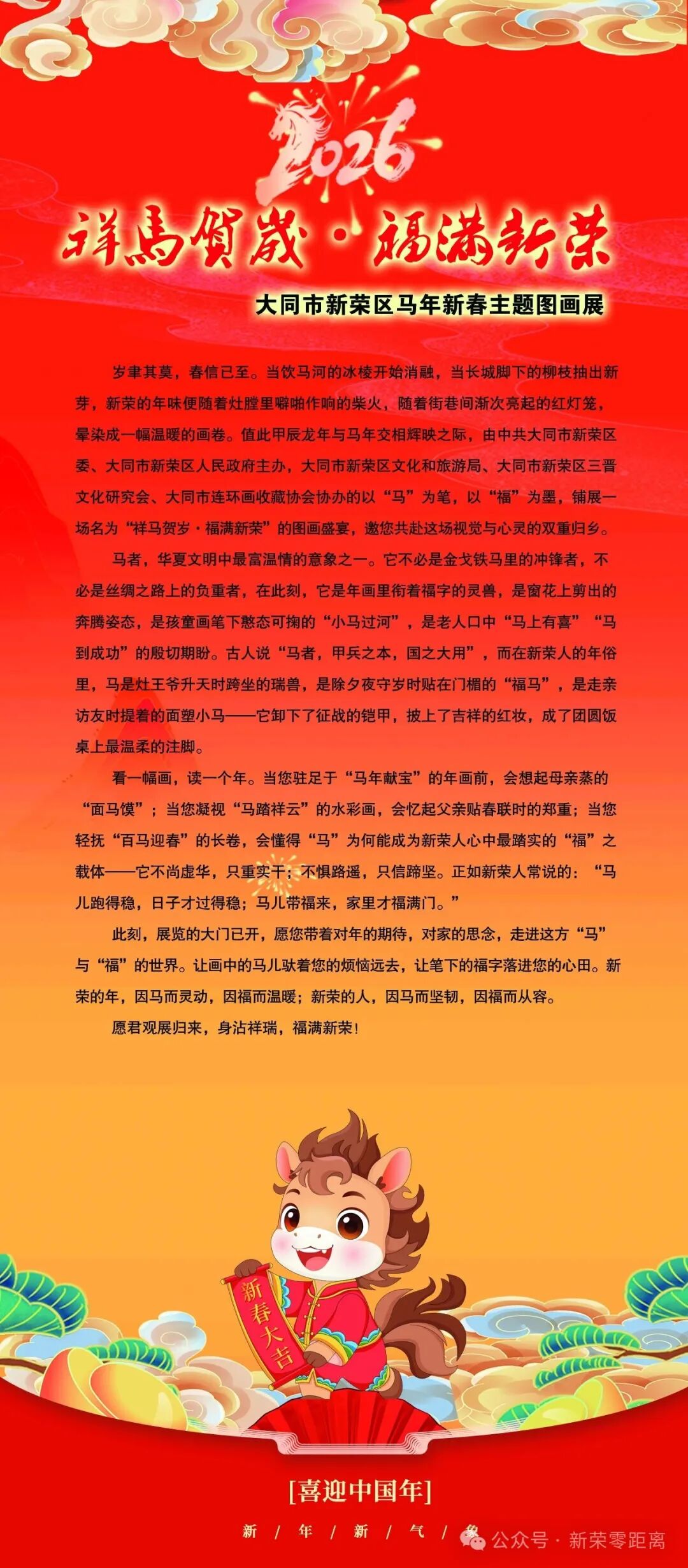 当北风捎来腊梅的暗香,当街巷渐次亮起中国红的灯影,新荣区的年味正随时光的鼓点,在2026年的初春里蓄势待发。值此马年祥瑞之际,新荣区要给您一份特别的“年礼”:“新春文艺晚会”与“马年新春主题图画展”将在于2026年2月10日(腊月廿三)下午3时同步启幕。