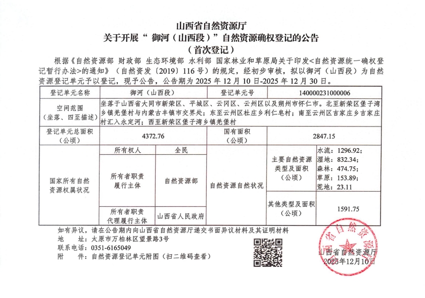 山西省自然资源厅关于开展“御河(山西段)”自然资源确权登记的公告