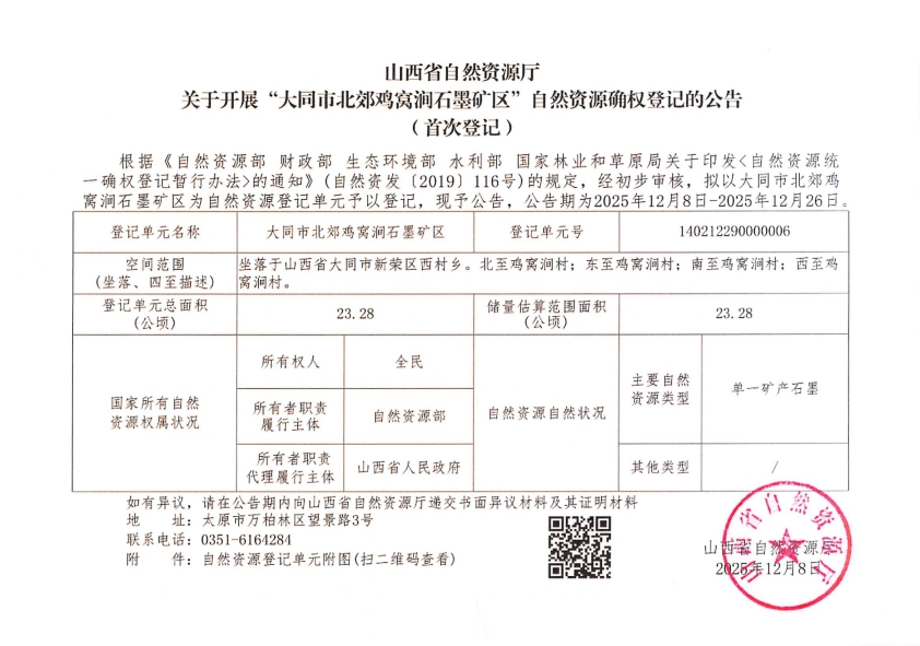 山西省自然资源厅关于开展“大同市北郊鸡窝涧石墨矿区”自然资源确权登记的公告