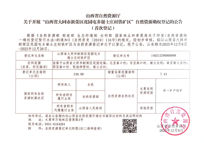 山西省自然资源厅关于开展“山西省大同市新荣区花园屯乡谢士庄村铁矿区”自然资源确权登记的公告