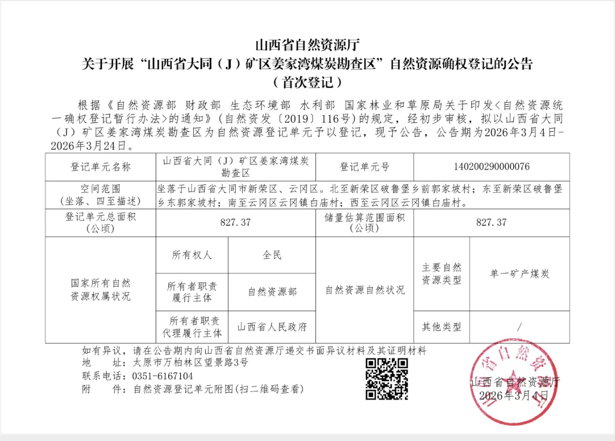 山西省自然资源厅关于开展“山西省大同(J)矿区姜家湾煤炭勘查区”自然资源确权登记的公告